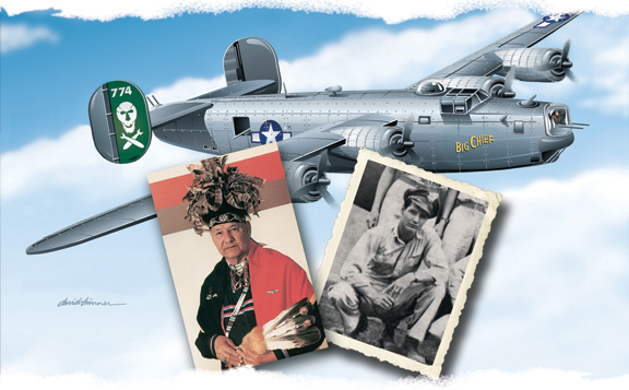 Leaford Bearskin was born in 1921. When he enlisted in the Army Air Corps in 1939, he was initially assigned to Alaska as a crew chief, but after World War II broke out, Bearskin entered flying cadet school, received his pilot wings and went into heavy bombardment training. The war took him to the South Pacific, where he flew in the same squadron as my dad, the 321st of the 90th Bombardment Group (Heavy), the “Jolly Rogers.” He and his crew called his plane, “Big Chief.” Like the other pilots and crews, they never knew if they would return from any given mission.