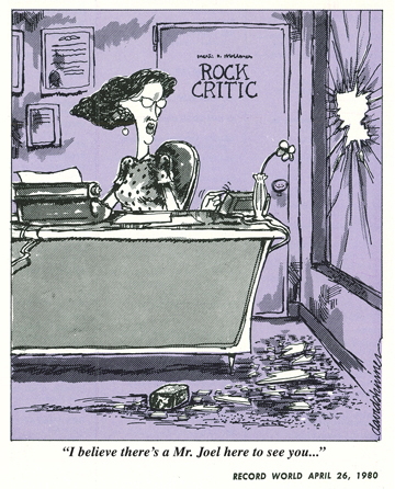 As songwriters, both Ran and I thought Billy Joel was a master of the craft. When Joel released his “Glass Houses” album (complete with a cover shot of him on the verge of hurling a brick through his real-life Long Island glass house), I was surprised when many of the critics panned it. At the time, I was art director of the music trade magazine, Record World, and I drew an industry-related cartoon every week. After one particularly scathing “Glass Houses” review appeared, I decided to fight back with the RW cartoon and turn the brick around on the critics. The cartoon depicted a rock critic’s office where the brick had just been thrown through the lobby window. The critic’s secretary was on the intercom to her boss, saying, “…I believe there’s a Mr. Joel here to see you…” People in glass houses, indeed. Some of the guys at Columbia Records (Billy Joel’s label) loved the cartoon, and they showed it to his people. A couple of days later, I got a call from the editor of the Billy Joel newsletter asking if they could re-print the cartoon.
