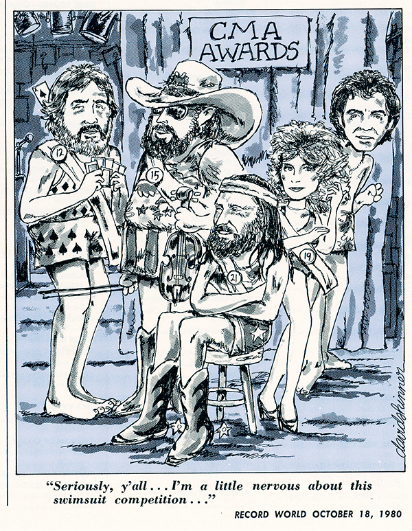 I had brought a couple of print-outs of cartoons I had drawn back in the early ’80s for Record World magazine, both of which featured Charlie Daniels. One of them, which I had drawn to highlight the 1980 CMA Awards, showed the finalists for that year’s Entertainer of the Year, and they were all dressed in swimwear. In the cartoon Charlie was saying, “Seriously, y’all…I’m a little nervous about this swimsuit competition…”