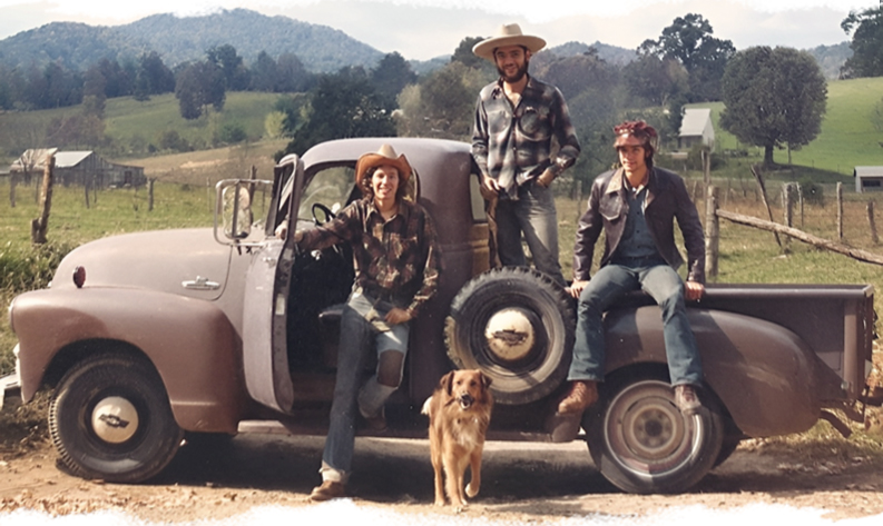 The only member of Contents not in the picture was (Dancin’) Dan (the Man) Schlafer; he had joined the band in early 1971, and by the time the long-lost picture was snapped—in the autumn of 1974—Dan was well on his way to being a responsible citizen, unlike the three of us pictured here. The backdrop for this picture was the 40-acre farm in Wear’s Valley that I shared with Mike Copas and Stephen Kling, two Opryland caricature artists that I had worked with the previous summer. The truck actually belonged to Copas, but I loved it and the way it made me feel when I rode in it. The picture was taken by my sister, Jann; she had ridden down from Nashville with Paul Dunlap—that’s him with the leather jacket and red mod cap. Filmore (actually, Millard Filmore Strunk, Jr.) is the one with the flannel shirt and Tom Mix 10-gallon hat. I’m also wearing a flannel shirt, along with a pair of bell bottom jeans that my grandmother patched (this was before holes in jeans were cool). BoatRamp, the farmdog, was trying to imitate my stance and smile for the camera. He was a very talented dog.