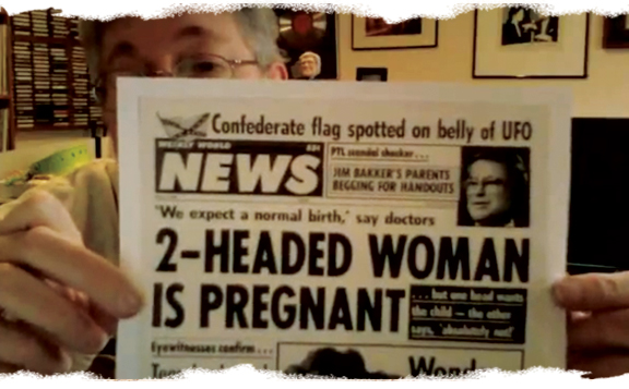 A few years after I moved to Atlanta (from New York), I stopped off at a Buckhead grocery after work to pick up a few things. While I was standing in line at the check-out, I scanned the tabloids in the rack beside the cash register. One of the papers, The Weekly World News, had a couple of headlines that caught my eye. The main one, “2-Headed Woman is Pregnant (One Head Wants the Child—The Other Says ‘Absolutely Not’),” looked pretty interesting, but the one that really intrigued me was the smaller one at the top with a picture of a rebel flag. It quietly announced: “Confederate Flag Spotted on Belly of UFO.”