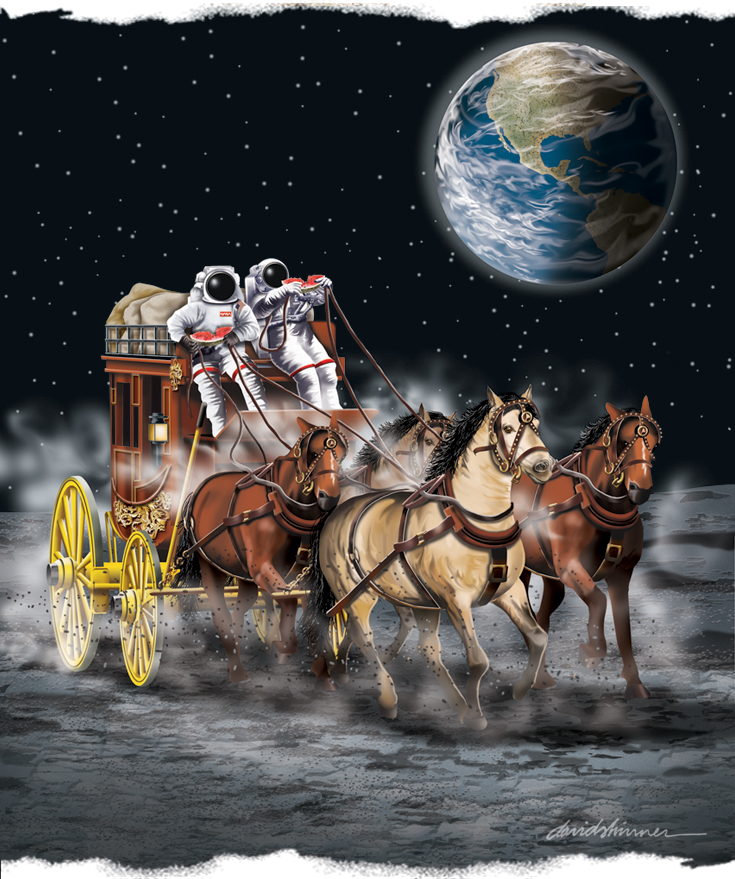 A few years later, as a college art major (with an emphasis in watercolor painting, mind you) I was trying to decide what my next painting would be when I stumbled onto a stash of my dad’s National Geographic magazines. One issue featured a pictorial account of the lunar walk; another included pictures from a rodeo. There was cattle roping, bronco riding, gunfight re-enactments and a genuine Wells Fargo stagecoach. I gathered up the NatGeo issues and brought them back to school with me to use as reference pictures for my paintings. One afternoon as they lay scattered on the floor of my little college art studio, I noticed that the rodeo issue with its stagecoach centerspread had somehow landed on top of the moonwalk cover. Even back then, I loved strange and unexpected juxtapositions and it looked like it would be fun to paint as a watercolor. However, when I presented the finished piece to my art professor, he studied it carefully with a squint and a grimace.