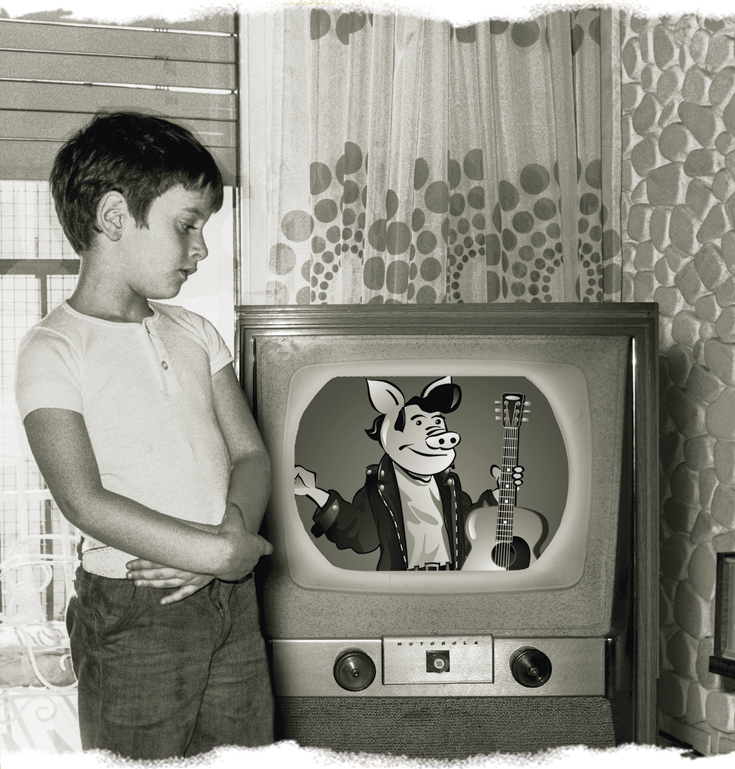 The folks took me home from the hospital to our little house on Vultee Blvd., named after the Vultee Aircraft Plant that was built during the war to manufacture Vengeance dive bombers, which were initially supplied to England’s RAF in their air war against Germany. My first memories are from that little house, and they’re mostly foggy glimpses of the bottom of chairs and tables. The one piece of furniture that does stand out, however, was our old Motorola cabinet black-and-white TV. I couldn’t see under it, but I do remember the cloth covering the speaker (that would have been eye-level to a crawling Nashville tot). What I loved most of all were the cartoons that jumped out of that old TV screen and into the hot living room on Vultee Blvd. And, the cartoon character that immediate comes to mind was not a Disney, Warners, or MGM cartoon star. Rather, it was the Rockabilly Pig, the spokesman (or should I say, spokespig?) for Jacobs Preferred (hot dogs, sausage and ham).